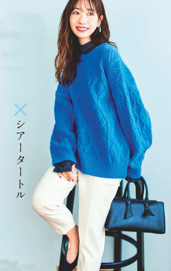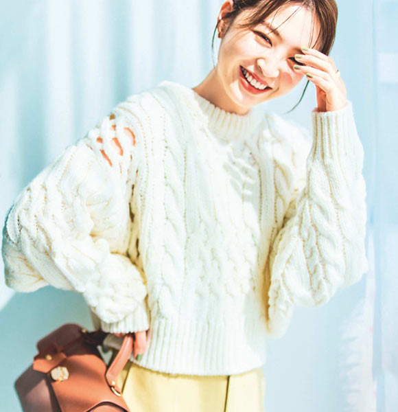 スプリングさんの色白肌が引き立つアイボリーのニット。肌がチラッと覗くざっくりとしたケーブルが抜け感のあるデザイン。キリッとシルエットのカラーパンツで大人顔に。