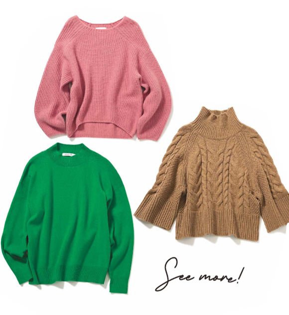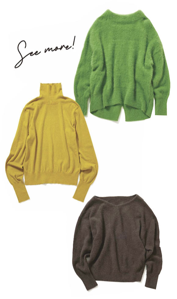 [上から]ふんわりと毛足の長いモヘアも深めグリーンなら甘さを抑えられる。ニット \20,900、インナーとしても使い勝手抜群。タートルニット \12,100 / ともにジネス、広めのネックが顔映りをすっきり見せる効果も。ニット \23,100 / エリオポール
