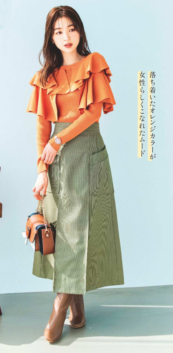 ドラマティックなフリルニットも肌馴染みのよい色なら品よく華やかな印象に。