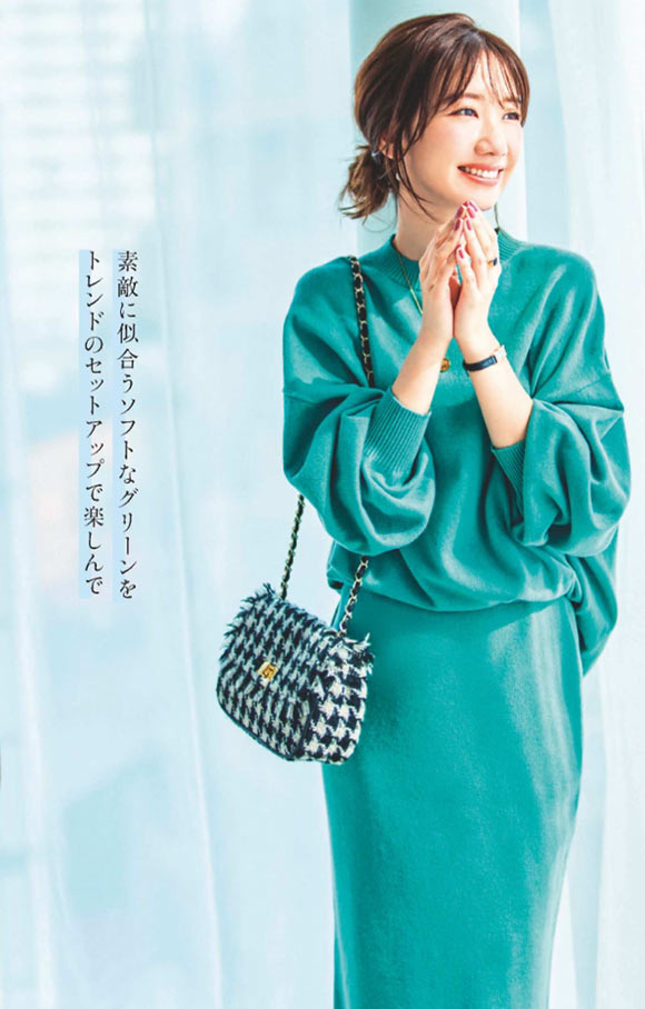 肌色にマッチしたニュアンスグリーンのセットアップが素敵オーラを放つ。ニットセットの柔和な雰囲気に、黒小物でメリハリを与えるのが好バランス。