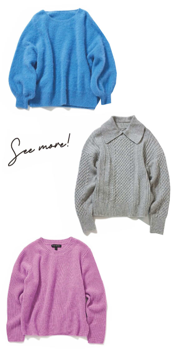 [上から]女性らしさを増量させるやさしげなモヘア。ニット \18,150,旬のトラッドなムードへと引き寄せる襟付きニットが新鮮!ニット \17,380 / ともにジネス(ジネスペリエ千葉店)くすんだトーンで甘くなりすぎず、ブルベサマーさんにしっくり。ニット \24,400バナナ・リパブリック