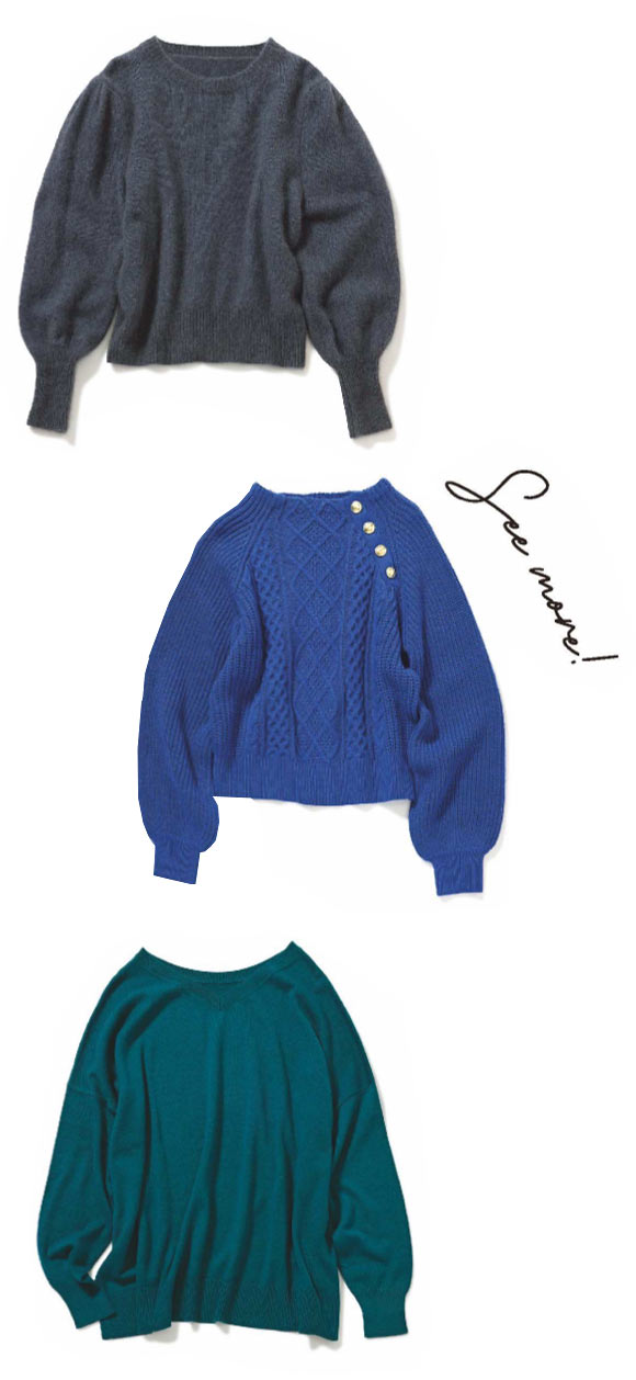 [上から]シャープなグレーが肌にマッチ。ニット \19,800 / ラブティックボンボン、濃ブルーにゴールドボタンがエレガントに映る。ニット \4,378 / ビス、ベーシックニットこそ、パーソナルカラーで差をつけて。ニット \7,590イェッカ ヴェッカ