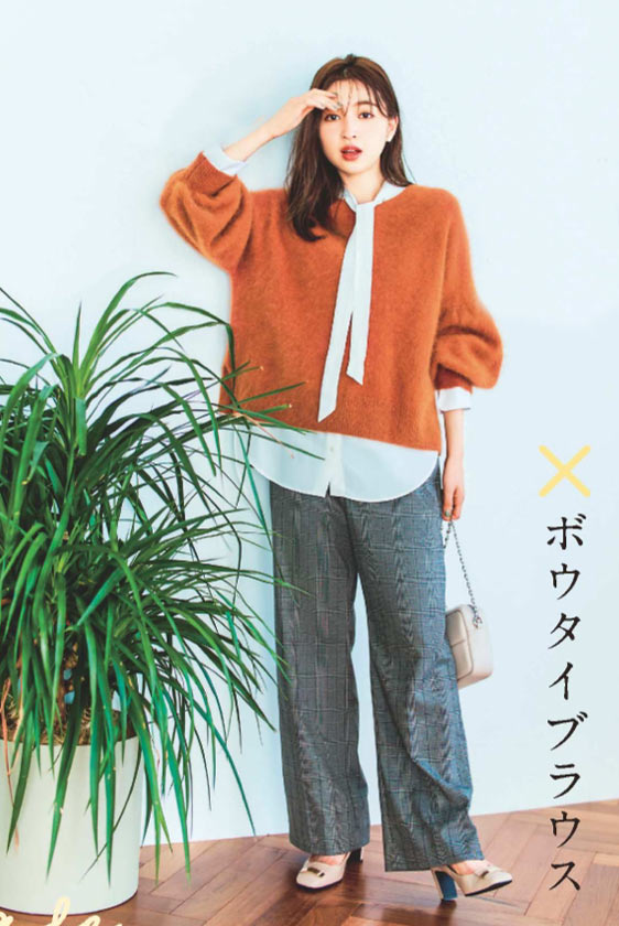 旬のボウタイを挟むことで、今年っぽさも肌への馴染みやすさもよりアップ。ニット \19,800 / ジネス