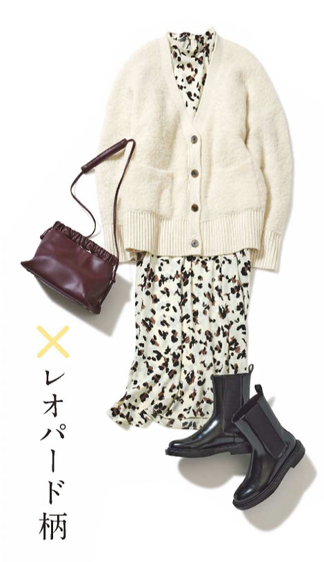 明るさのあるスプリング肌にそ、ライトブラウンのレオパード柄と白ニットが可愛げに映る。カーディガン \24,400 / バナナ・リパブリック