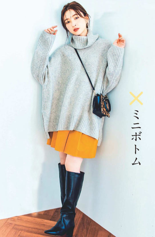 ゆるニットにはコンパクトなミニボトムで今年らしくヘルシーな装いに。仕上げのロングブーツでよりトレンド感をブッシュ。ニット \21,000 / プラステ