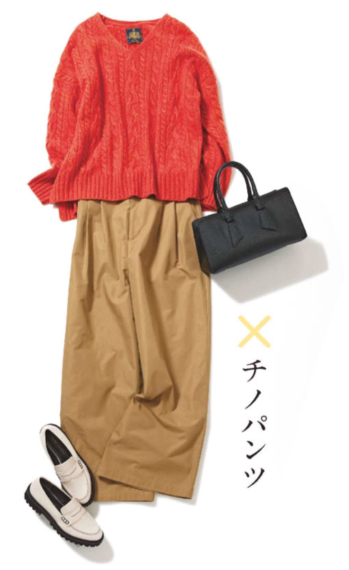 ハリのあるチノパンで、定番のワンツーコーデも今年っぽくアップデート。ニット \10,450 / アーバンリサーチ ドアーズ