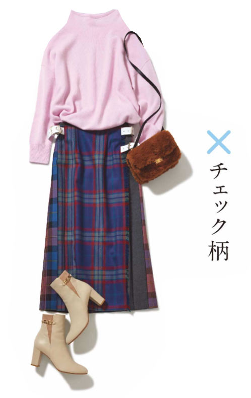 サマータイプならではのエレガントでやさしいラベンダーニットには、コントラスト強めのチェックスカートでメリハリを。ニットオンライン限定 \12,400 / バナナ・リパブリック