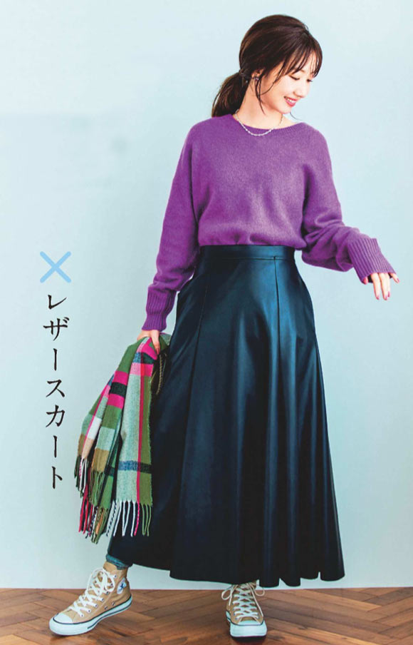 ウィンター肌に似合うシャープなカラーニットとつややかなレザースカートのコンビネーションが今っぽくマッチ。ニット \31,900 / ティッカ
