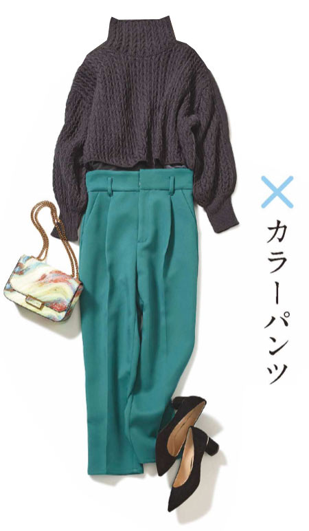 クロップト丈ニットも今年っぽさ抜群。暗めの色のニットの場合は旬のカラーパンツがキマリやすい。ニット \8,690 / ココディール