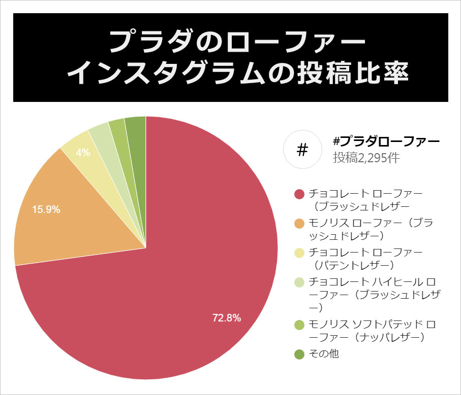 インスタグラムの「#プラダローファー」2295投稿から、ローファーを履いている投稿、ローファーを購入・プレゼントされた投稿、それらを集計し算出しました。