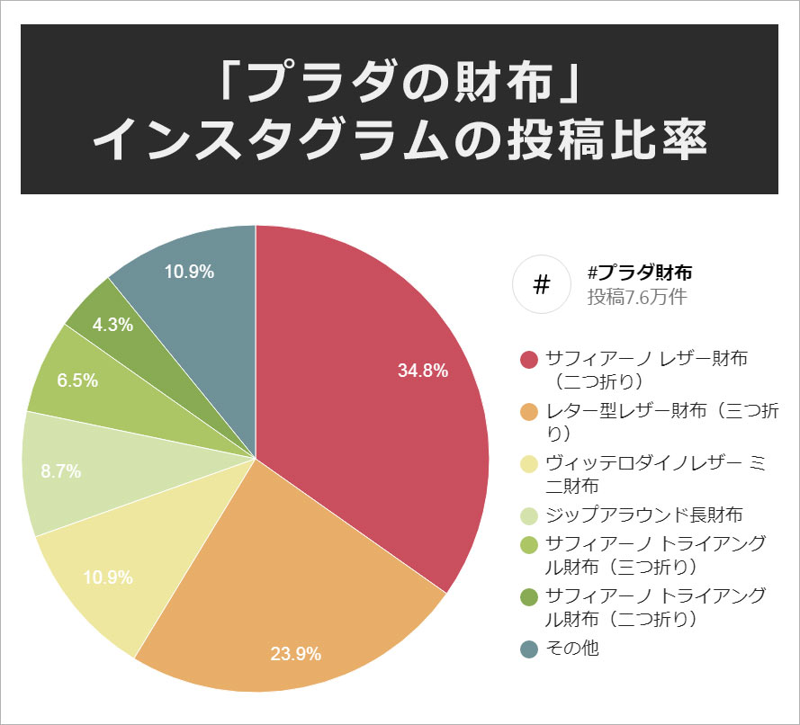 インスタグラムの「#プラダ財布」76,000投稿の中から、女性が実際に使っている投稿、プレゼントされた投稿、自分へのご褒美で買った投稿、それらを集計し算出しました。