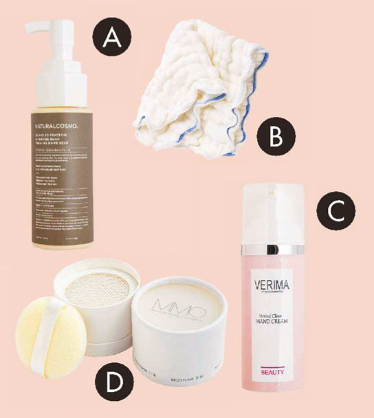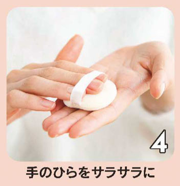 ハンドクリームのベタつきが気になる人は、Dのパウダーを手のひら側のみにポンポンとのせて。表面がサラサラになり作業しやすい!