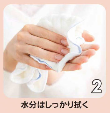 肌にやさしいBのタオルで指の間までしっかり水分を拭き取って。乾燥しにくい保湿成分入りタオルを使うとそれだけでもしっとり♪