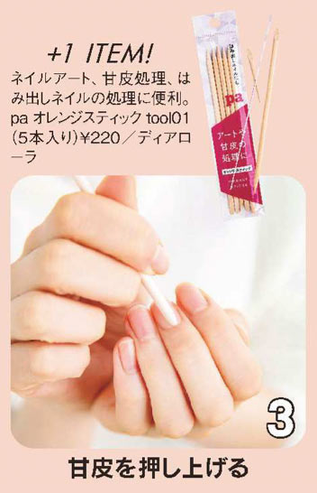 上の甘皮専用のスティックを使用し、2でやわらかくなった余分な甘皮を、やさしく押し上げていく。やりすぎないように注意しよう。