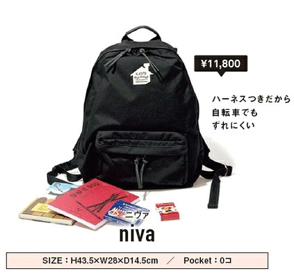 nivaダブルジップでガバッと開く開け口、ショルダーパッドなど荷物いっぱいでもラクに持ち運べます。