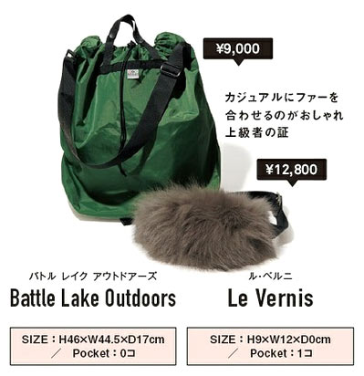 ファーのリッチな存在感を前面アピール! ベビーの荷物は2WAYで持てる丈夫なナイロンバッグへ。使わないときはコンパクトにたためるのも魅力。