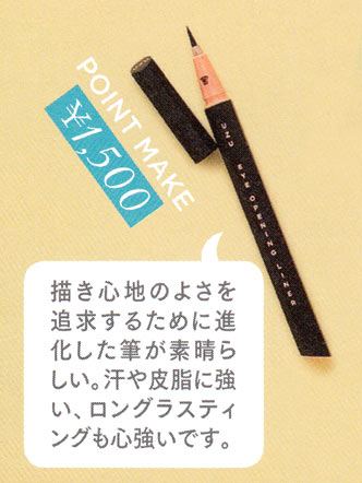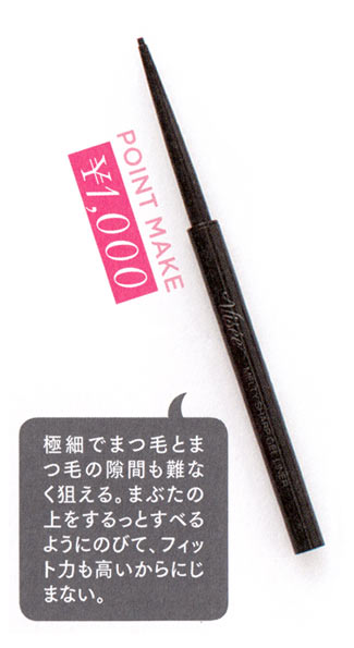スムースタッチオイル配合のジェルがとろけるようになめらか。デリケートな目もとの皮膚にひっかかることなく、1.5mmの極細芯で狙い通りのラインが描ける。ウォータープルーフタイプ。