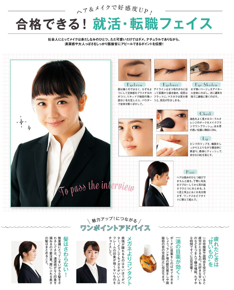 (左)シャツのボタンはきっちりとめるなど、きちんとした着こなしを守るべき。ヘアはストレートで、巻くとしても毛先だけゆるく。のびているときはひとつ結びなどでスッキリした印象に見せるのが正解。