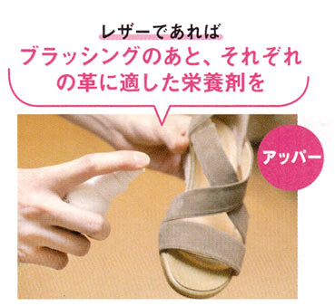 アッパーは、レザー素材なら定期的にブラッシングしてほこりを落として。そのあとに栄養剤を塗りこむとキレイをキープできます。