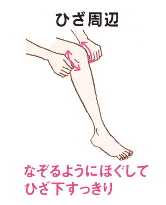 肉がつきやすいひざ周辺もグ一の形にした指の背で、ぐるぐるとなぞってほぐしましょう。