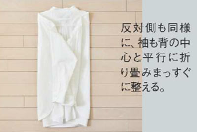 反対側も同様に、袖も背の中心と平行の折り畳みまっすぐに整える。