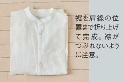 裾を肩線の位置まで折り上げて完成。襟がつぶれないように注意。