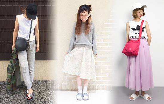 アディダスのシャワーサンダル×おしゃれな着こなし