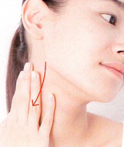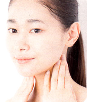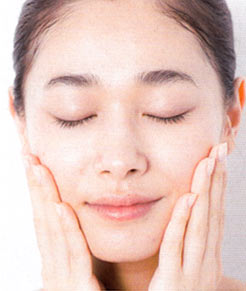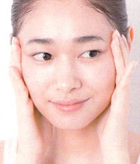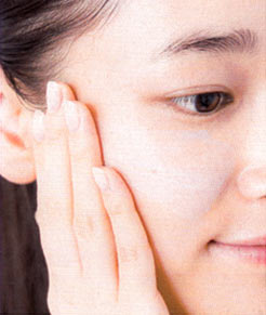 顔の内側から外側に向けて塗る。細かい部分には指の腹を使い、なでるようになじませて。余ったものは首筋までのばす。
