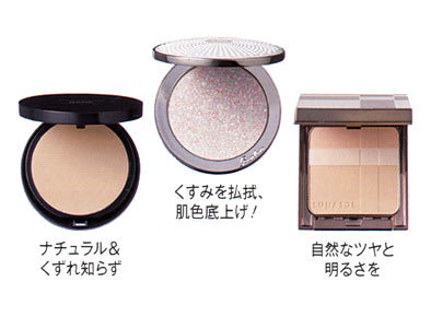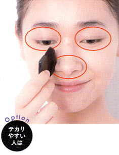 小鼻のテカリや目元・口元のヨレが気になる人は、プレストパウダー(左ページ)をパフやブラシにとり、薄くなじませるとくずれにくい。