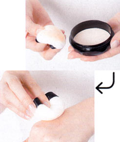 パウダーファンデーションをパフの2面にとる。手の甲でなじませて、パフの毛足にファンデーションをよくなじませる。