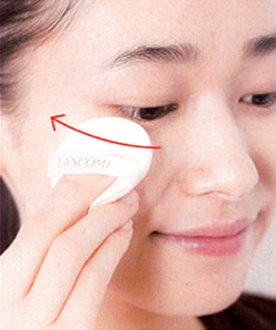 顔の中心から外側へ、パフの表面を肌にポンポンとあてるようにしてファンデーションをなじませる。細かい部分はパフを折って。