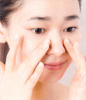 指の腹を使って小鼻にたたき込む。最後に軽くなでてなじませると表面がなめらかになり毛穴が目立ちにくく。残りは目元や口元に。