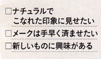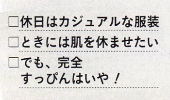 仕事のパフォーマンスを上げるためにも、オフはきちんと休息。きっとそんなメリハリある生活ができてこそ、真の自立した女性だから、休日にベースメイクするならほとんど素肌で、気になるとこだけちょっぴりカバーがちょうどいい♪
