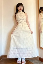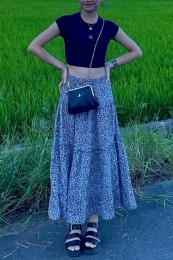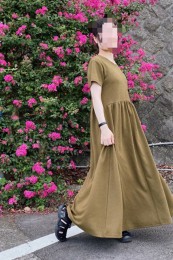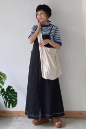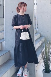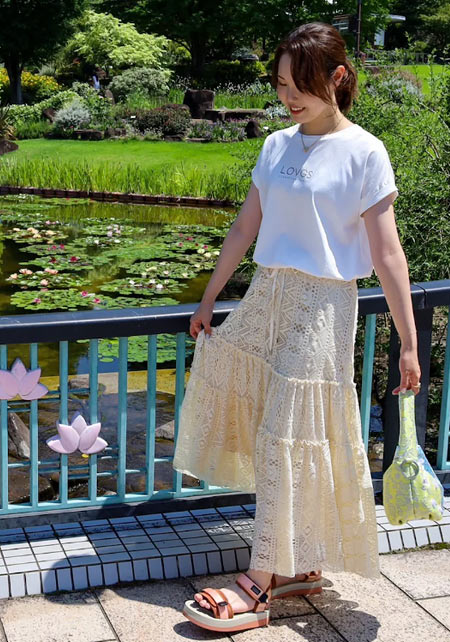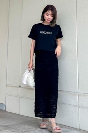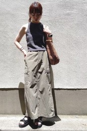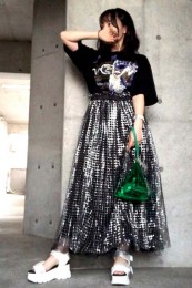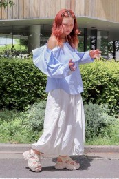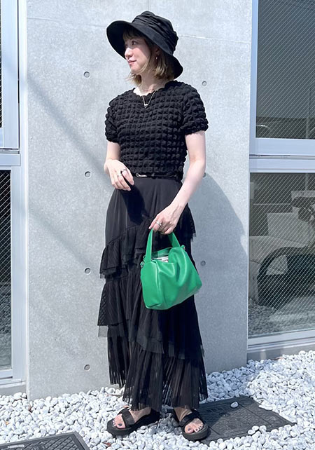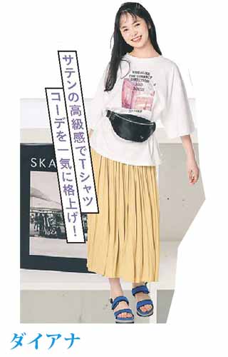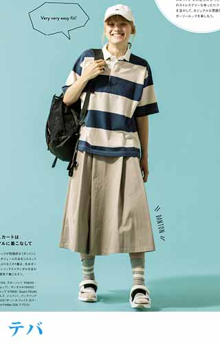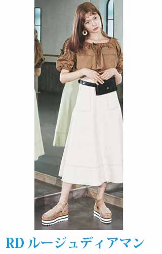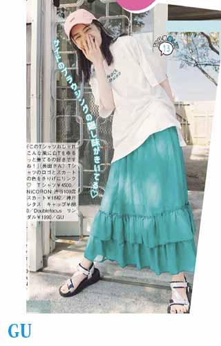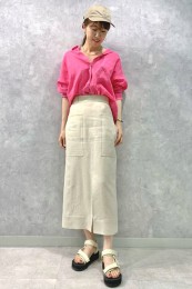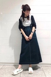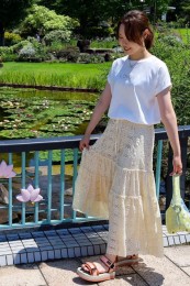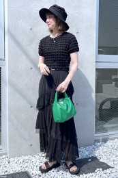 〈コーデ〉大きなカラースカートを夏素材に衣替え♪ ドットブラウスでママ可愛く着こなしたり、Tシャツでヘルシーに着回したりと、夏中楽しめます。