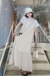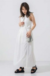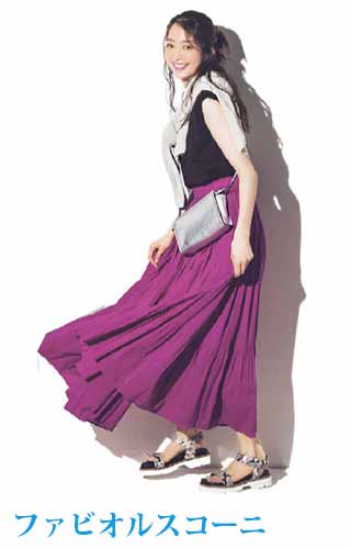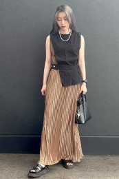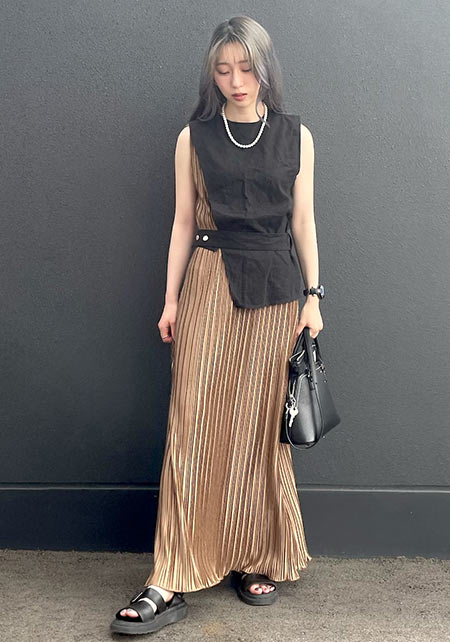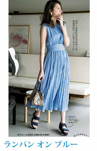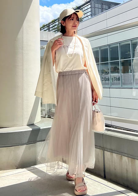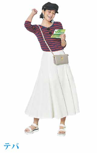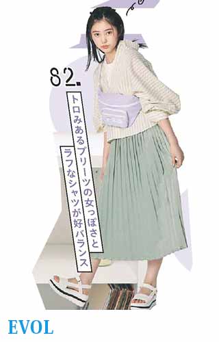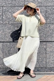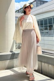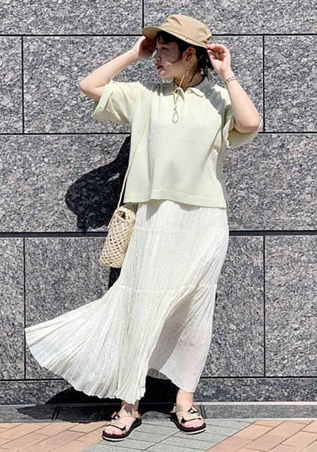 〈コーデ〉リゾートでも爽やかに映えること間違いなし! ビビッドカラーをエレガントに見せるプリーツスカートに、スポサンをON。