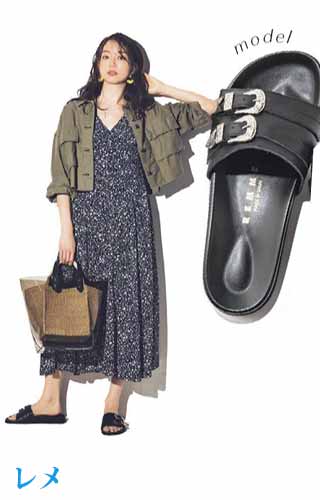 右)黒とゴールドのコンビになったサンダルはモダンな雰囲気。厚めのモールドソールで履き心地も抜群です。