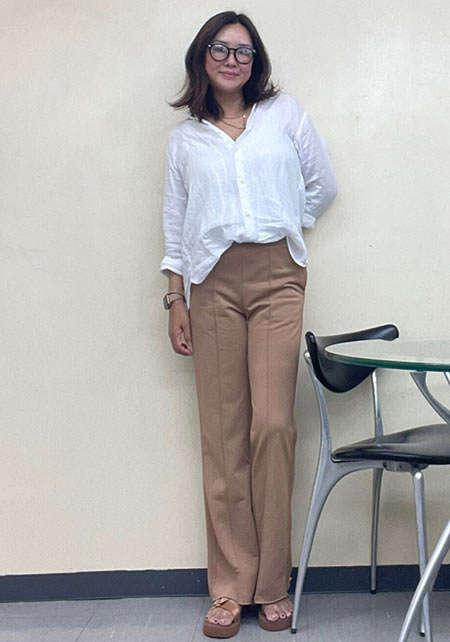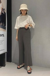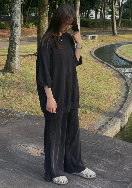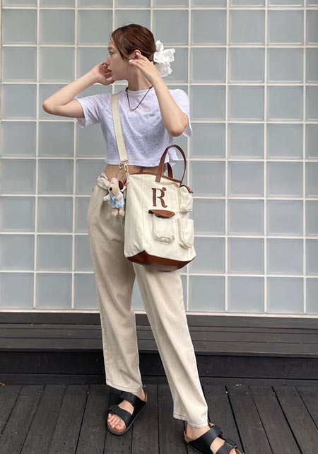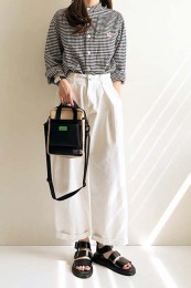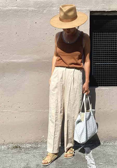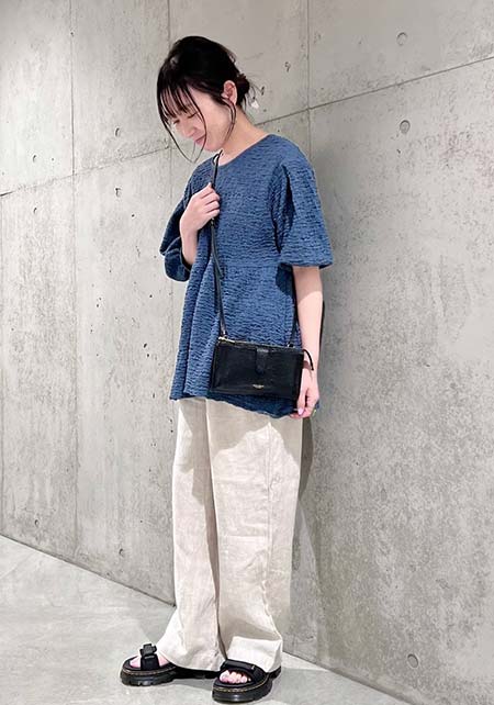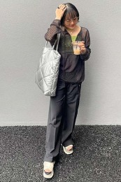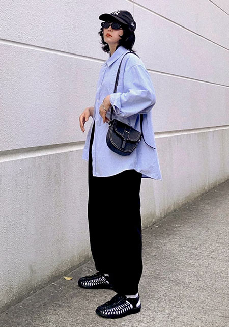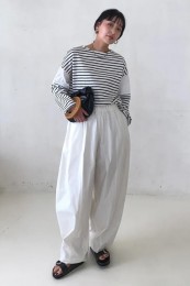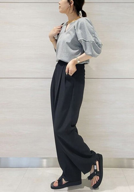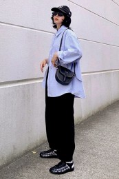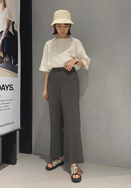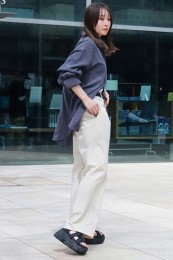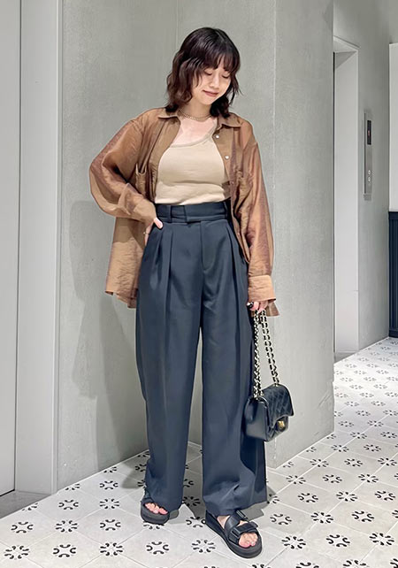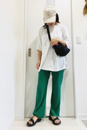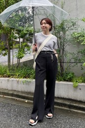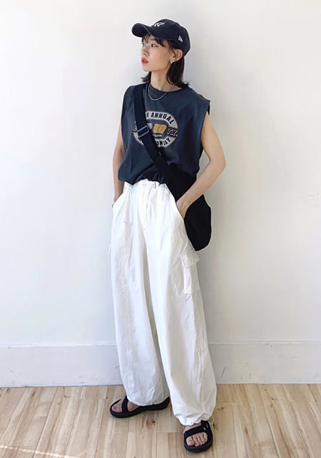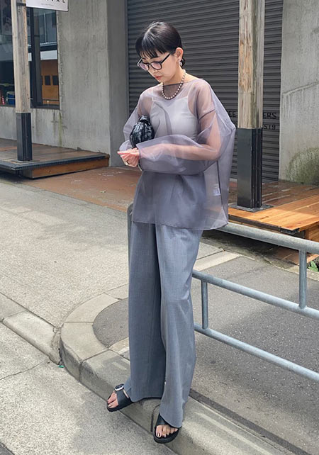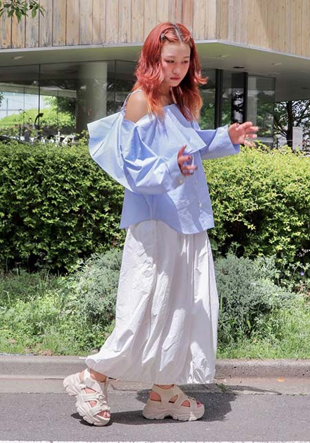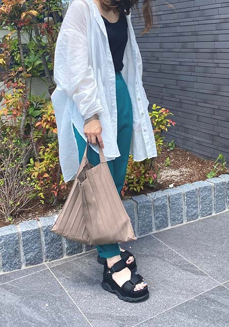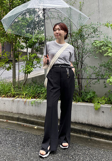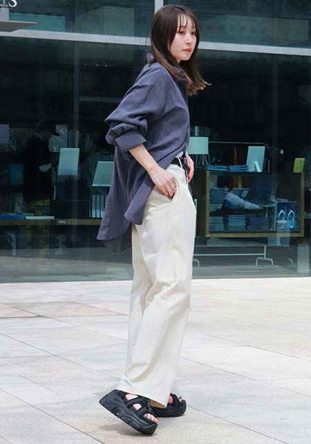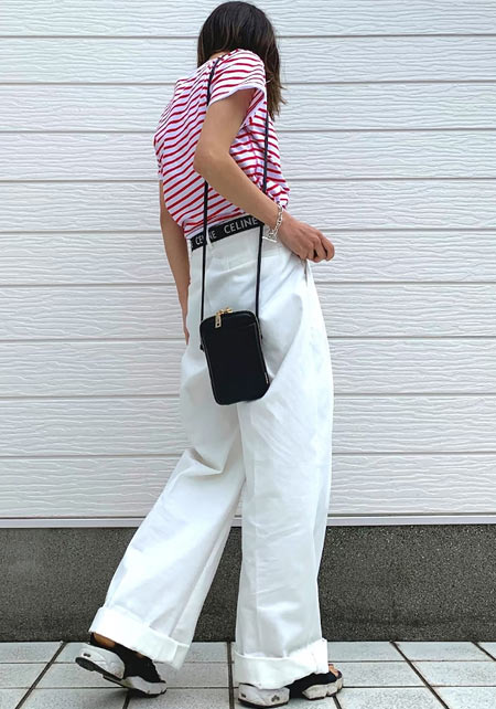 〈コーデ〉センタープレス入りのクリーンなパンツにスポサンを合わせれば、狙っていたハイストリートなモードっぽさも楽々クリア。ボリュームのあるインパクトデザインが、このスタイルにはお似合い。