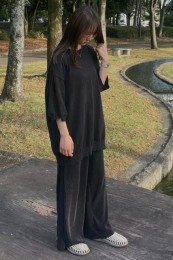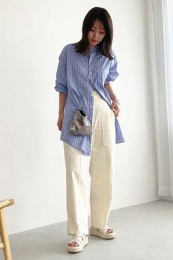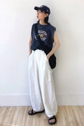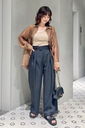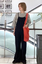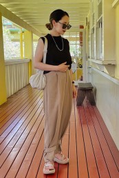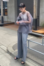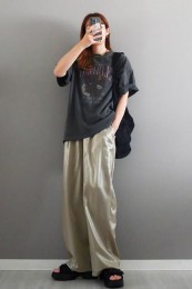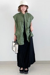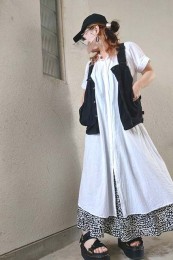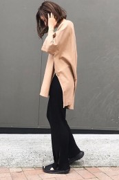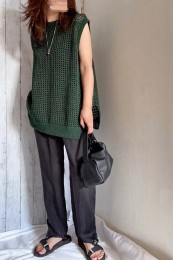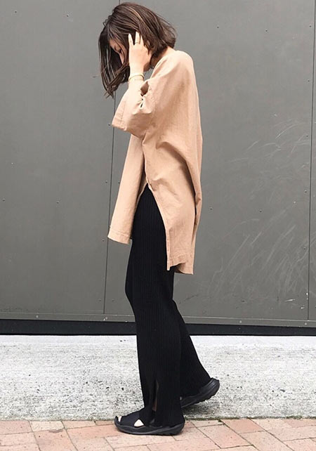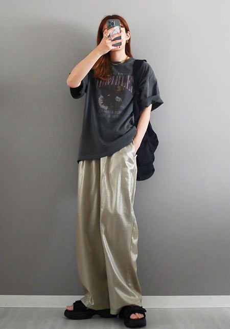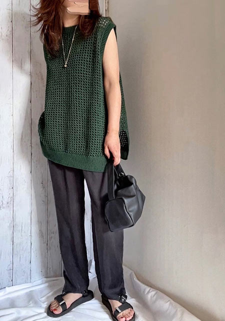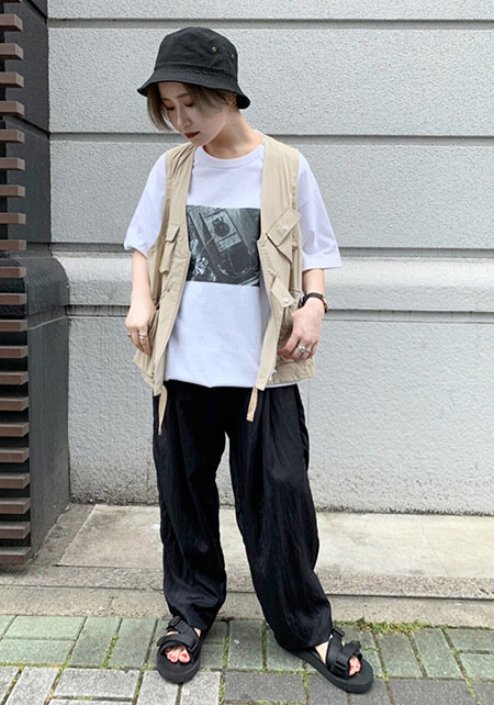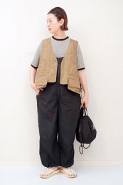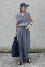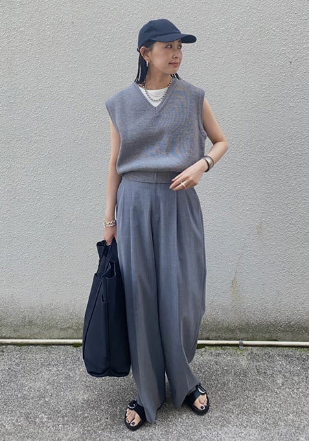 〈コーデ〉ゆるっとした服が全盛の今、ロングジレにワイドパンツなんていう組み合わせも最旬に見えるポイント! ボトムは流行のレギンス or スキニーパンツでもOK
