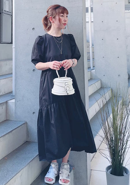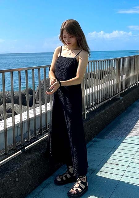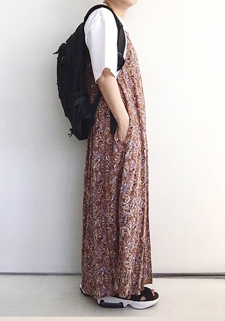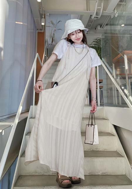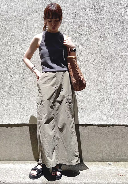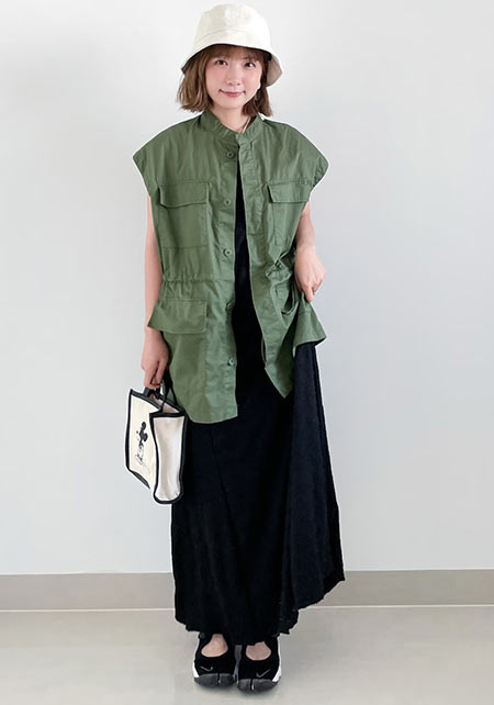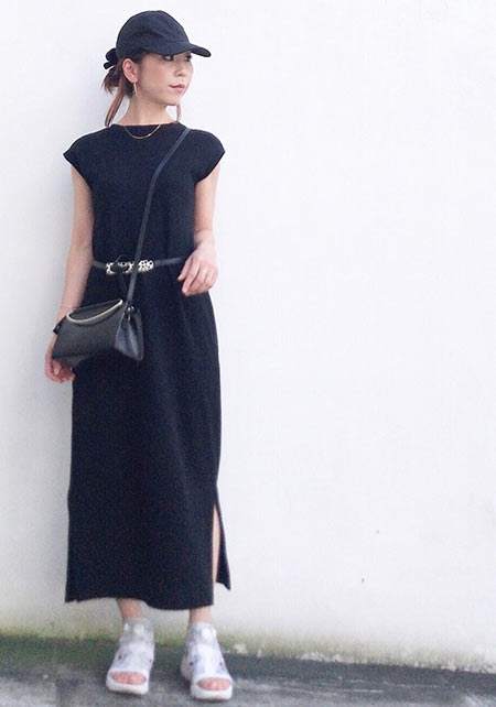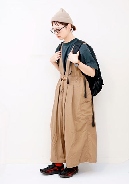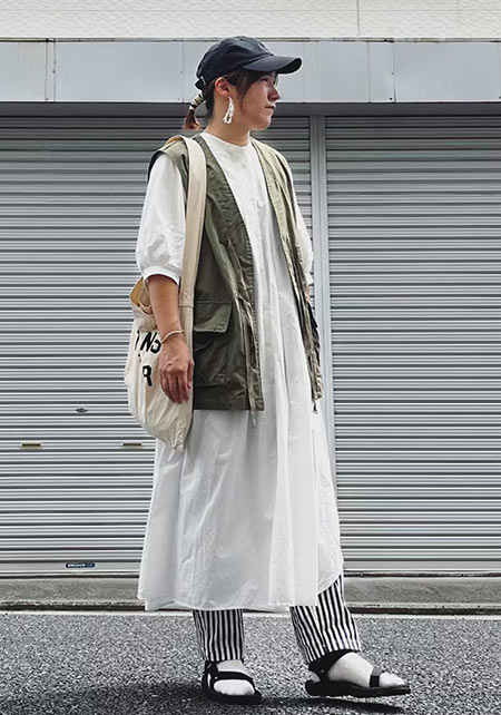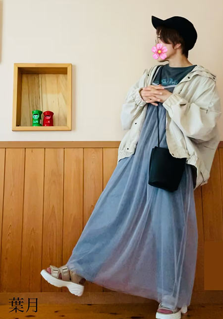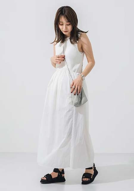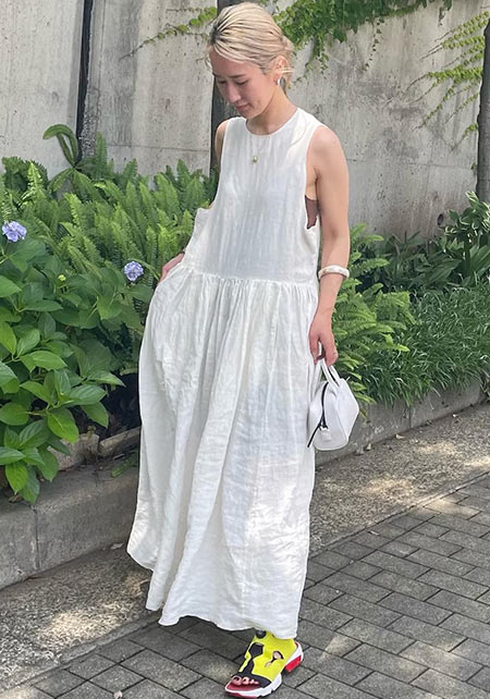 〈コーデ〉軽やかなマウンテンパーカー×ワンピースのアスレンジャーコーデには、スポサンがお似合い♪ スタイルアップも叶うこのモデルは、スポサンに抵抗のある人こそ選んでほしい。