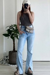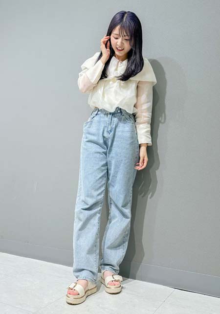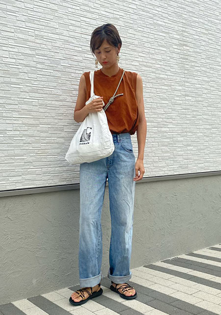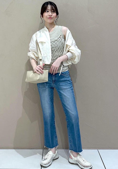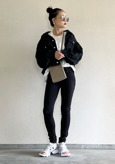 〈コーデ〉カジュアルの代表選手、デニムとスポサンの最強タッグ。トップスに、色やシルエットで甘さや大人っぽさを盛り込むとグッと深みが出て、オシャレな今どき感がUPします!