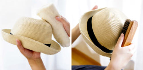 このとき、麦わら素材につかないよう注意。その後、水でぬらしたタオルを堅く絞り、2回拭く。素材によってはしみになる場合があるので、まずは目立たない部分で試してから行うようにして。