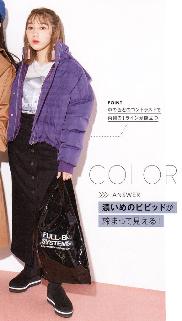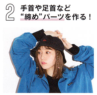 着ぶくれ防止のため、首、手首、足首、ウエストなどを意図的に締めメリハリを!