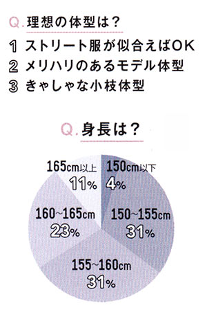 みんなの体型の悩みをアンケートで調査。ガチガチの着やせより、ストリートっぽくおしゃれで、細く見えるくらいが理想の模様。