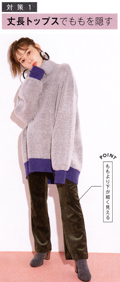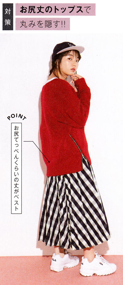 太ももの終わりギリ丈のトップスで隠す作戦。多少太ももがパツパツでも見えないのでOK♪