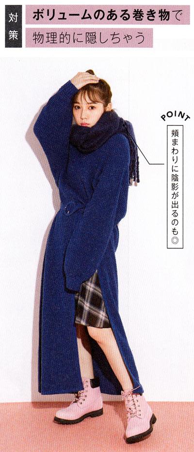 ぐるぐる巻きの巻き物で顎を隠しつつ、頬に落ちる影でシェーディング効果を狙って!