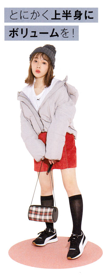 上半身を大きく見せることで対比的に細く! ハイウエストで膝上が10cm以上の超ミニで脚をとことん出すのが成功の近道です!
