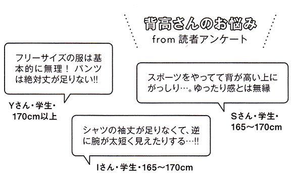 お悩みの内容が他と一線を画す背高さん。「ゆる見せ」や「落ち感」がレディース服じゃ叶わないならメンズ服に頼るしかない…!