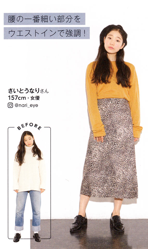 タイトめなアイテムを選んで縦長に見せます!スカートはウエストインでくびれを作り、ヒョウ柄で下半身のシルエットを目くらまし♪