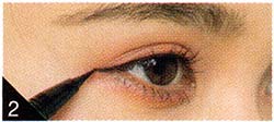 Cのアイラインを黒目の終わりから目尻を少しはみ出して入れる。Dの黒を上下に塗ってまつ毛に存在感を出す。