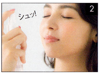 ミスト状化粧水を吹きかけて、肌を引き締めつつ潤い補給。湿りすぎないよう30cmは離し、浮いている水分は手のひらで押し込んで。